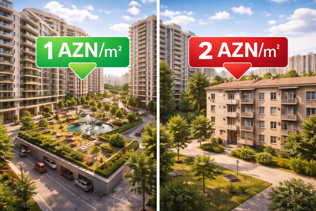 Yəni, xidmətlərin səviyyəsi yüksəldikcə, ümumi xərclər artır, bu da formul üzrə 1 m² üçün düşən məbləğin yüksəlməsinə səbəb olur.